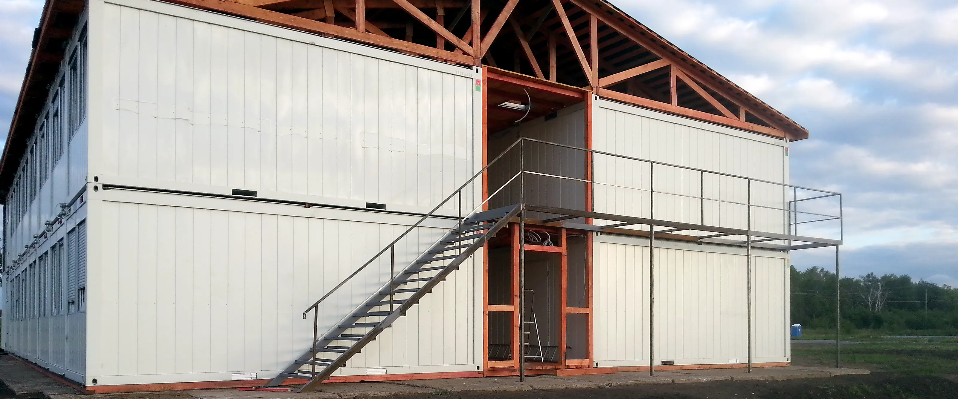 Компания Contegra выполнила проект двухэтажного модульного здания “Штаб строительства” из 32 б/у блок-контейнеров Контейнекс для компании STRABAG в Ульяновской области. Конструкция выполнена с независимой коридорной системой, общей двухскатной кровлей и металлокаркасом под наружную лестницу второго этажа, что обеспечивает удобство и безопасность эксплуатации.